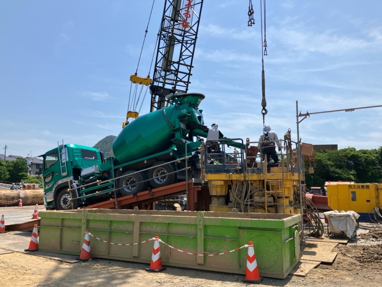 工事の進捗状況としては、6月に場所打ち杭工の施工が終わり、7月より仮設工の鋼矢板の圧入作業を行い、8月20日現在は橋脚躯体工を行うための立坑掘削の方を進めています。現場周辺には多数の住宅が近接するため、粉塵及び騒音、振動等による苦情が可能性として高い為、これらに対する対策、予防を重点に作業を進めています。また立坑掘削完了後、本格的に躯体工の作業に入るため、足場を使用し作業を行う予定です。この時に、足場からの転落事故が無いよう墜落抑制器具の使用等を必ず行い、安全第一にて施工を行っていきます。