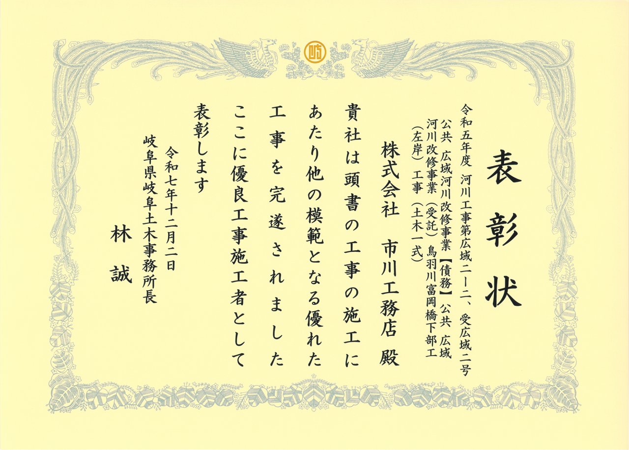 2025.12.02 岐阜県岐阜土木事務所より優良工事施工者として表彰されました。 岐阜県岐阜土木事務所より「鳥羽川富岡橋下部工(左岸)工事(土木一式)」において優良工事施工者として表彰されました。 岐阜県岐阜土木事務所より優良工事施工者として表彰されました。 一覧へ戻る